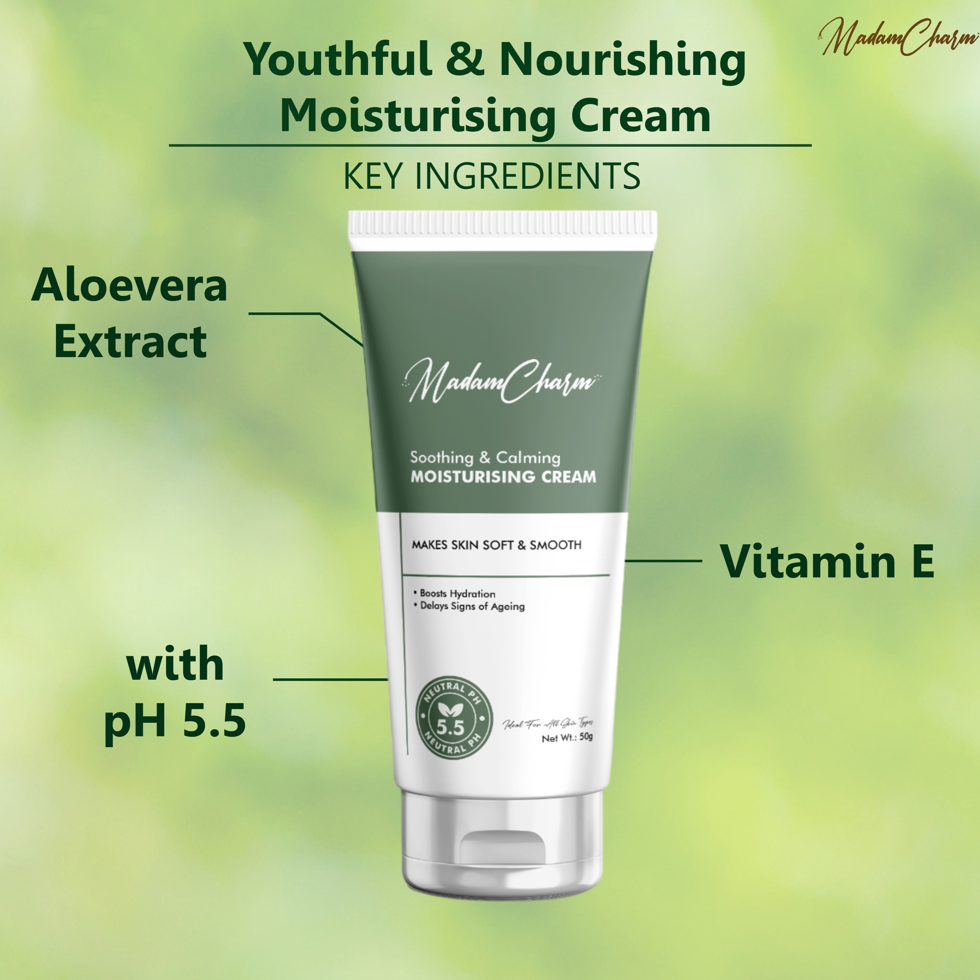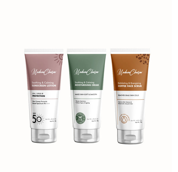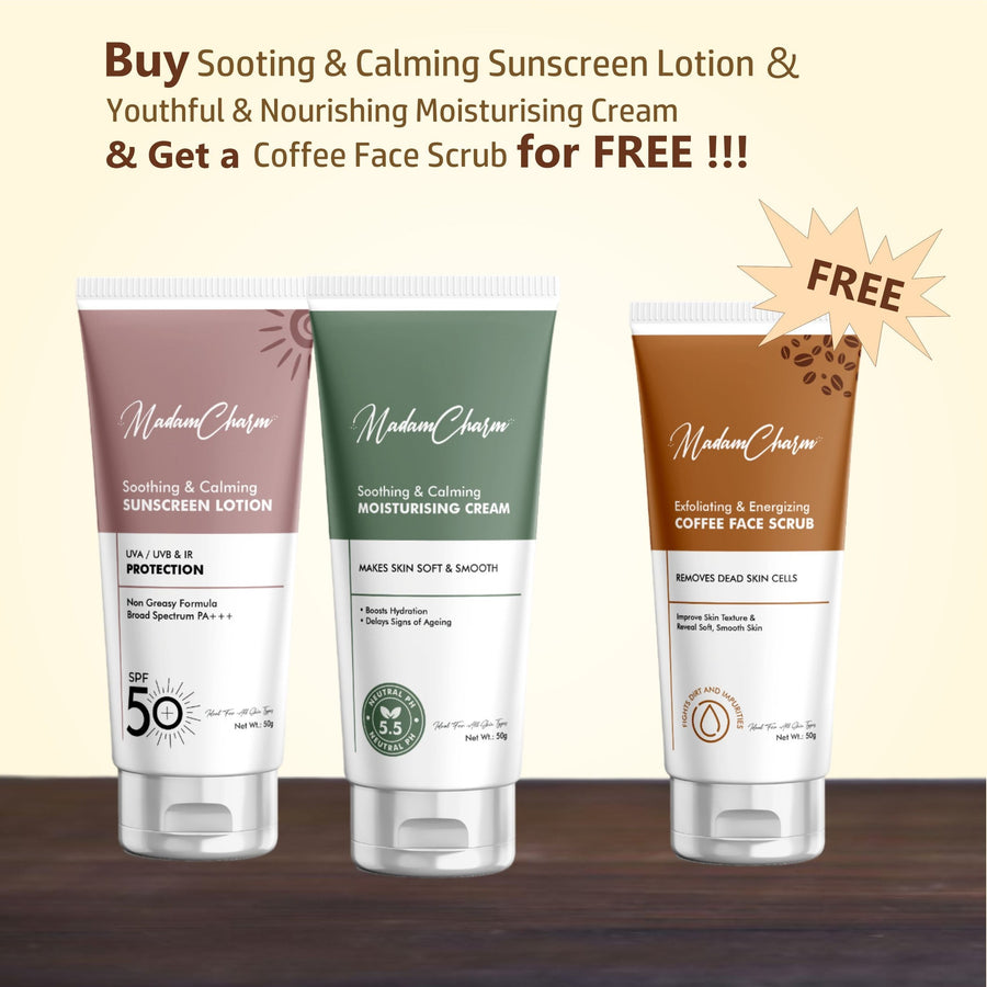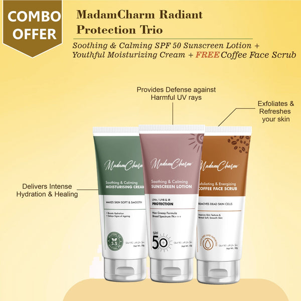 Achieve glowing, protected skin with MadamCharm's Radiant Protection Trio. This all-in-one set includes our Soothing & Calming SPF 50 Sunscreen Lotion and Youthful & Nourishing Moisturizing Cream, plus a FREE Exfoliating & Energizing Coffee Face Scrub to keep your skin radiant, hydrated, and safe from the sun. This Trio-set contains 3 Products : Soothing and Calming Sunscreen Lotion 50 g Youthful & Nourishing Moisturising Cream 50g FREE Exfoliating & Energizing Coffee Face Scrub 50 g Why Choose This Trio? This trio is perfect for those looking to protect their skin from the sun while maintaining a youthful, hydrated glow, with the added bonus of an energizing exfoliation.
