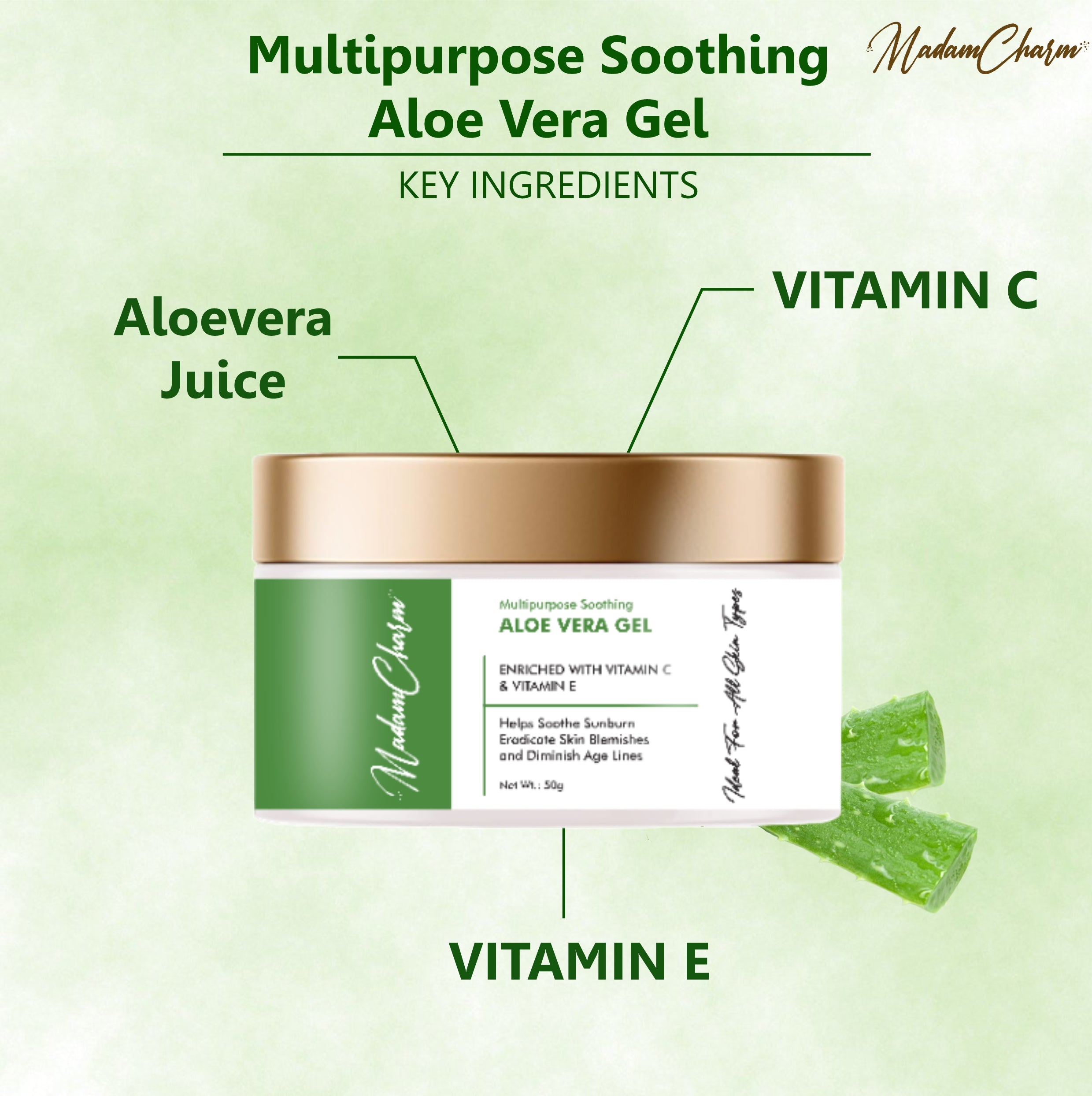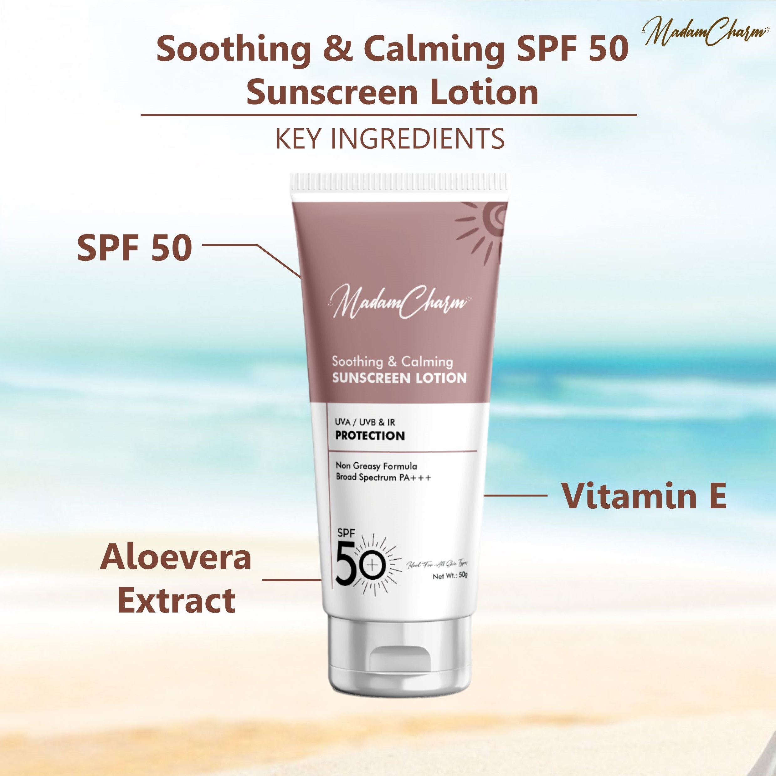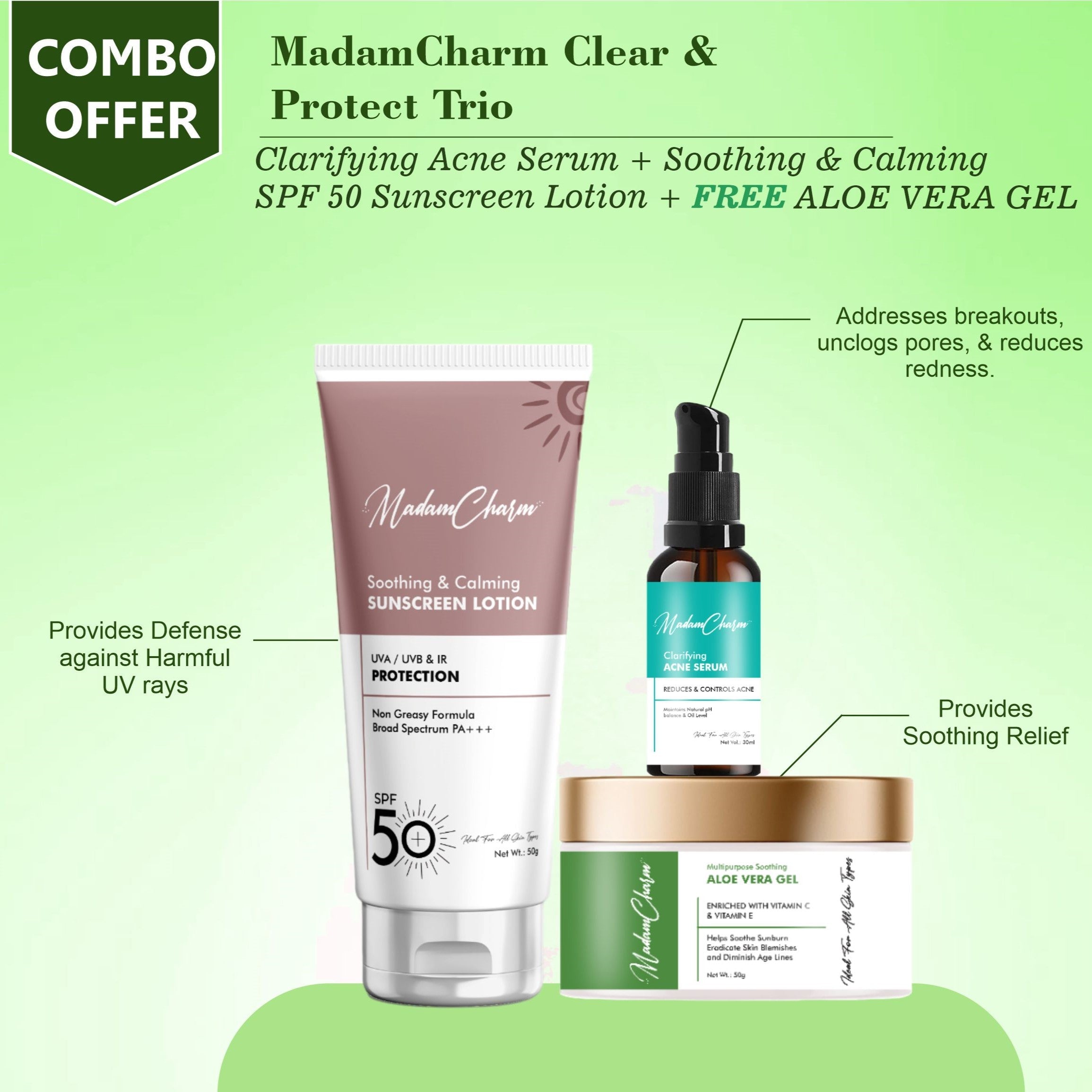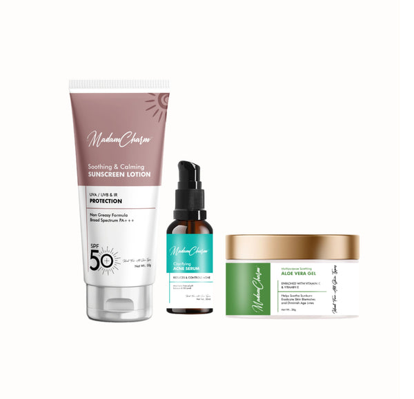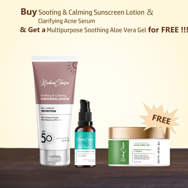 Guard your skin against the sun and breakouts with MadamCharm's Clear & Protect Trio. This powerful combo includes our Soothing & Calming SPF 50 Sunscreen Lotion and Clarifying Acne Serum, plus a FREE Multipurpose Soothing Aloe Vera Gel to keep your skin protected, clear, and calm. This Trio-set contains 3 Products : Soothing and Calming Sunscreen Lotion - 50 g Clarifying Acne Serum - 30 ml FREE Multipurpose Soothing Aloe Vera Gel - 50 g Why Choose This Trio? This trio is perfect for those who need effective sun protection and acne care, with the added benefit of a soothing and hydrating gel. With MadamCharm's Clear & Protect Trio, you get a comprehensive skincare solution plus a FREE product to enhance your daily routine.
