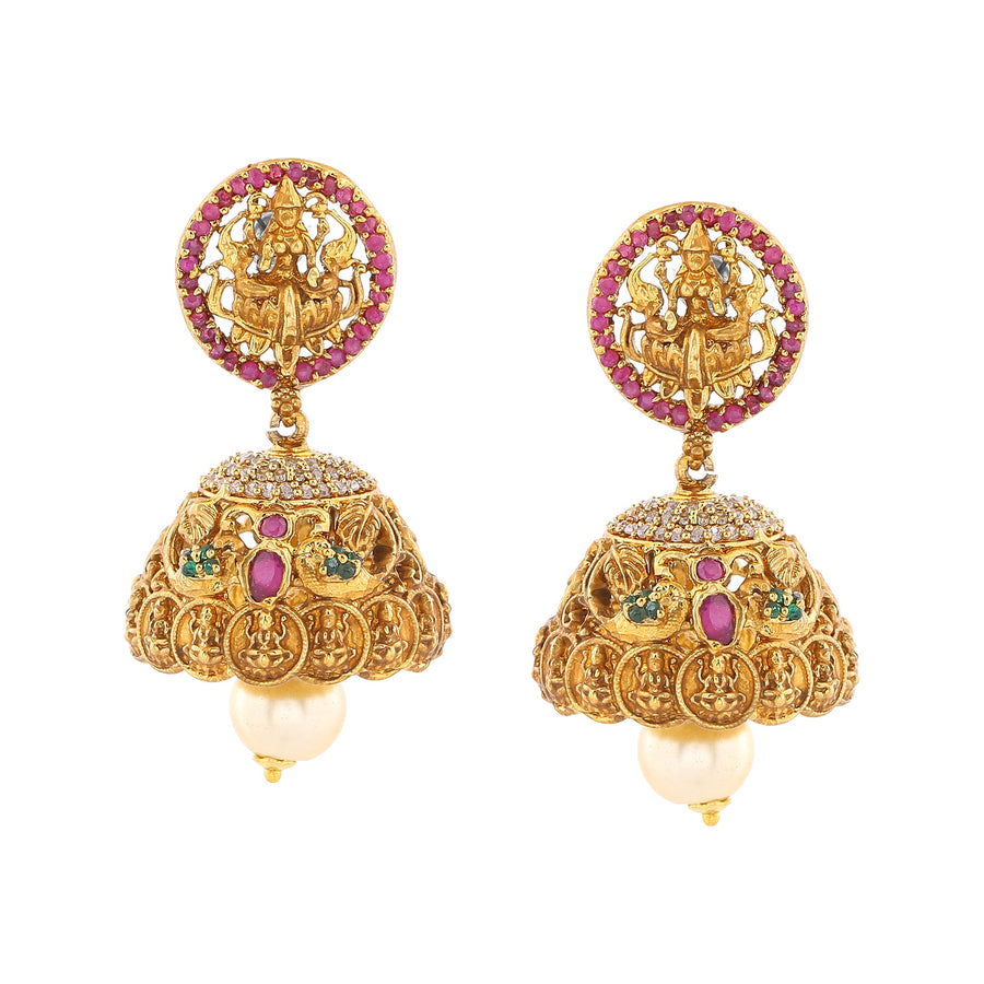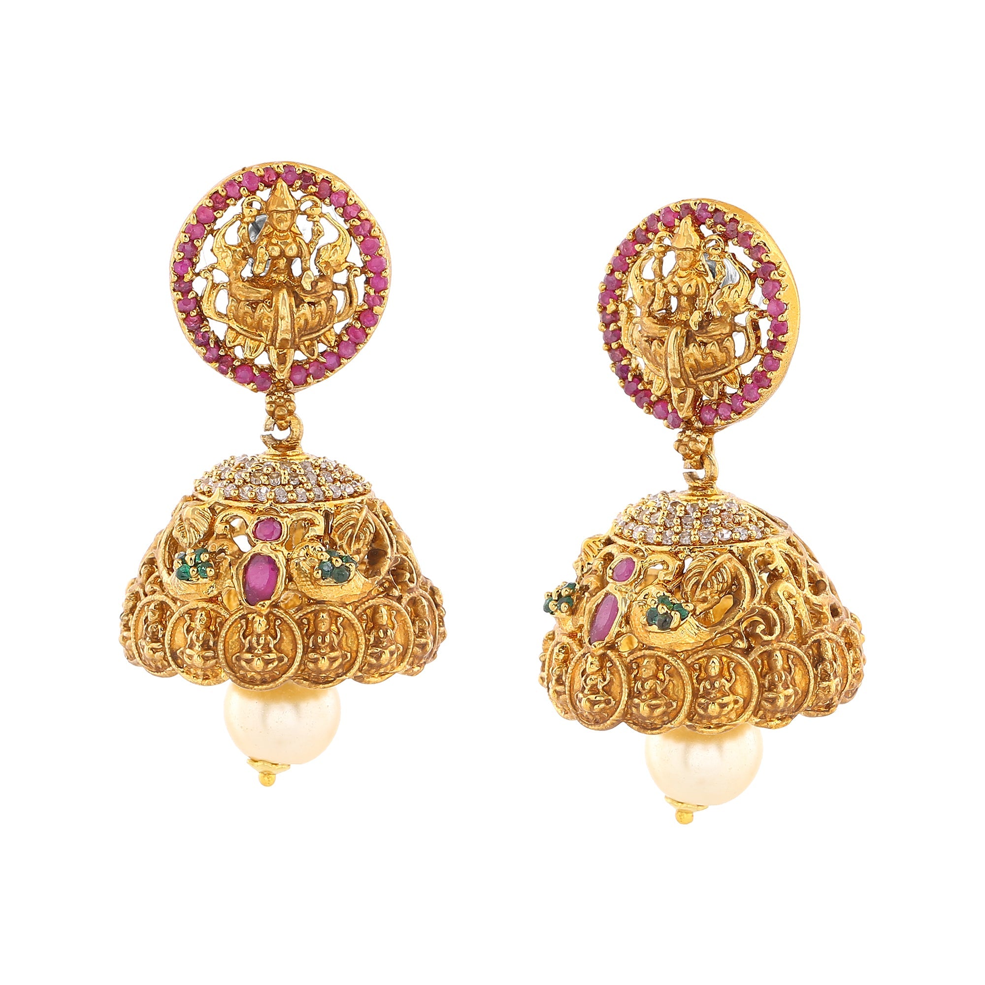 Estele Gold Plated Cz Goddess Lakshmi Devi Designer Jhumki Earrings With Pearls For Women