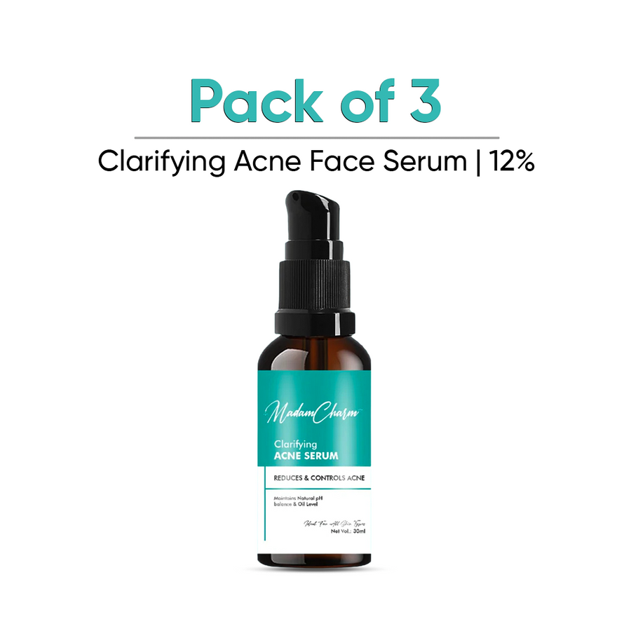 Pack of 3 MadamCharm Clarifying Acne Face Serum with 12% Niacinamide (30ml) Achieve clearer, healthier skin with MadamCharm Clarifying Acne Face Serum, a high-performance formula featuring 12% Niacinamide to target acne, pigmentation, and excess oil. Key Benefits: ๐ฟ Reduces Acne & Blemishes: Effectively minimizes breakouts, redness, and post-acne marks for smoother skin.โจ Fades Pigmentation: Reduces dark spots and uneven skin tone, leaving your complexion bright and radiant.๐ง Controls Oil Production: Balances excess sebum to keep your skin matte and refreshed all day.๐ธ Lightweight & Non-Greasy: Absorbs quickly into the skin, making it ideal for everyday use. Why You'll Love It: Powered by 12% Niacinamide, known for its proven skin-clarifying and brightening properties. Suitable for oily and combination skin types. Free from parabens, sulfates, and harsh chemicals. Incorporate MadamCharm Clarifying Acne Face Serum into your skincare routine and take control of acne, pigmentation, and oily skinโyour first step towards flawless, glowing skin