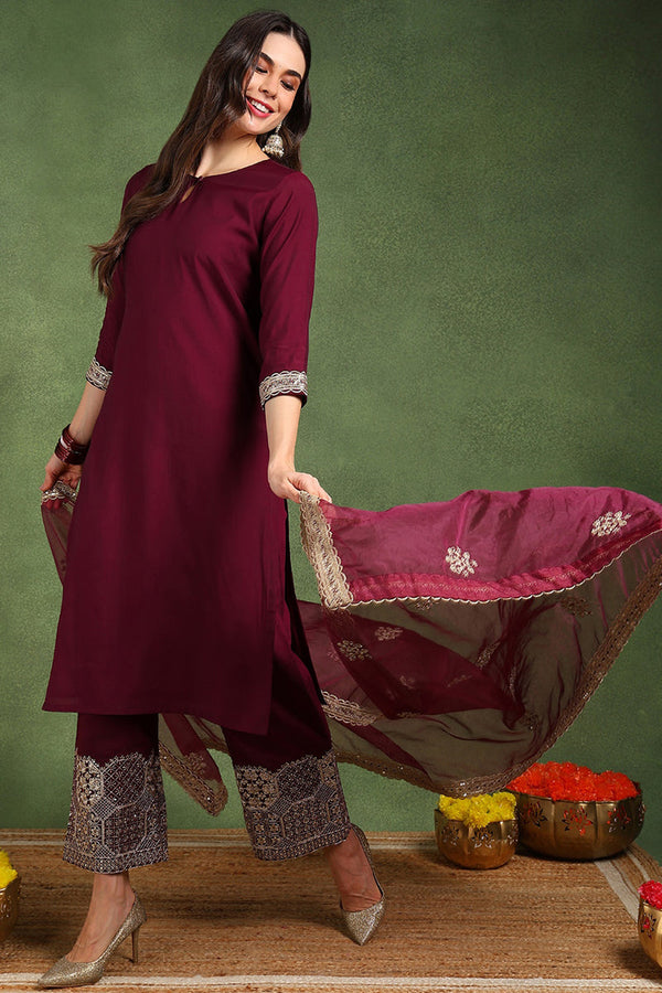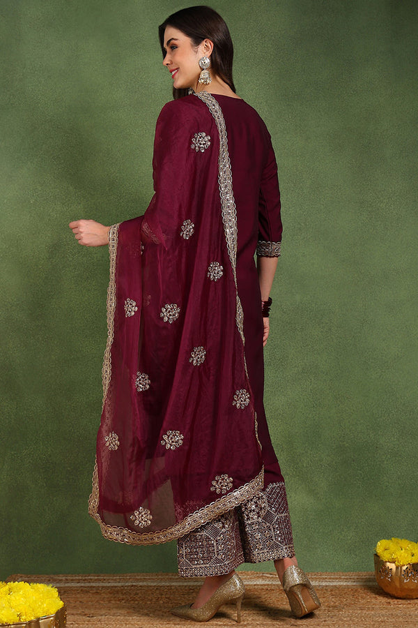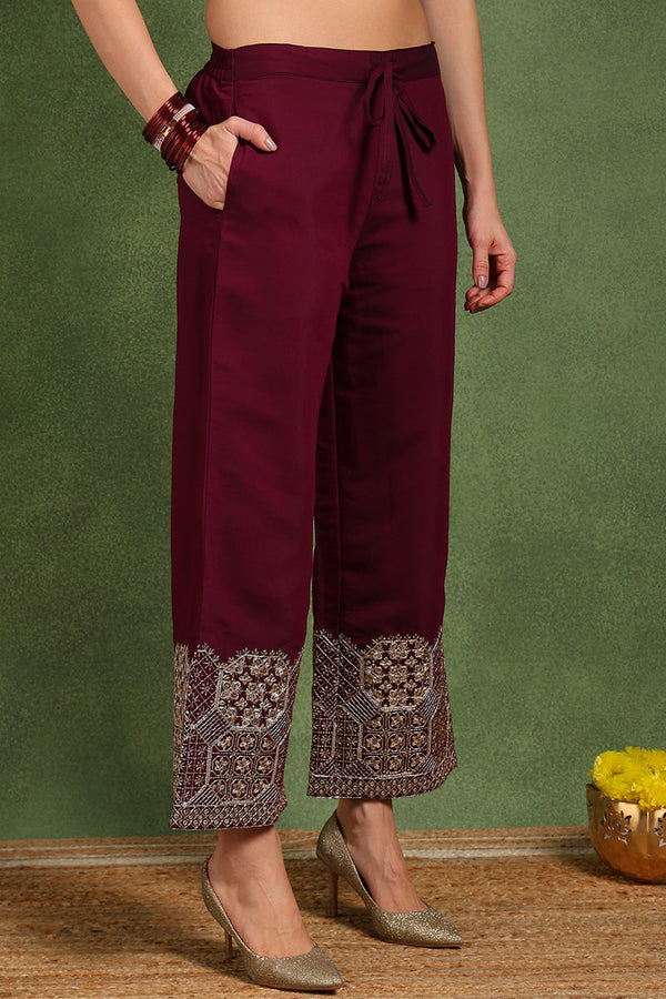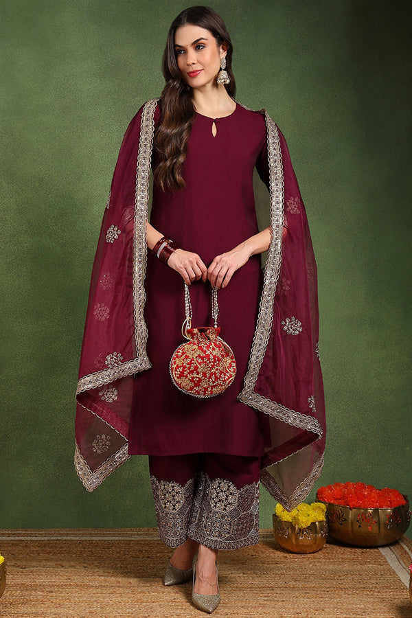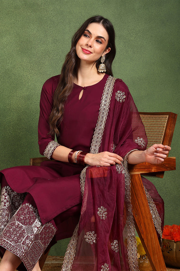 Crafted in a rich burgundy silk blend, this straight suit set with palazzo bottoms exudes sophistication and grace. The deep hue and minimalist embroidery make it an ideal pick for festive occasions or evening events.