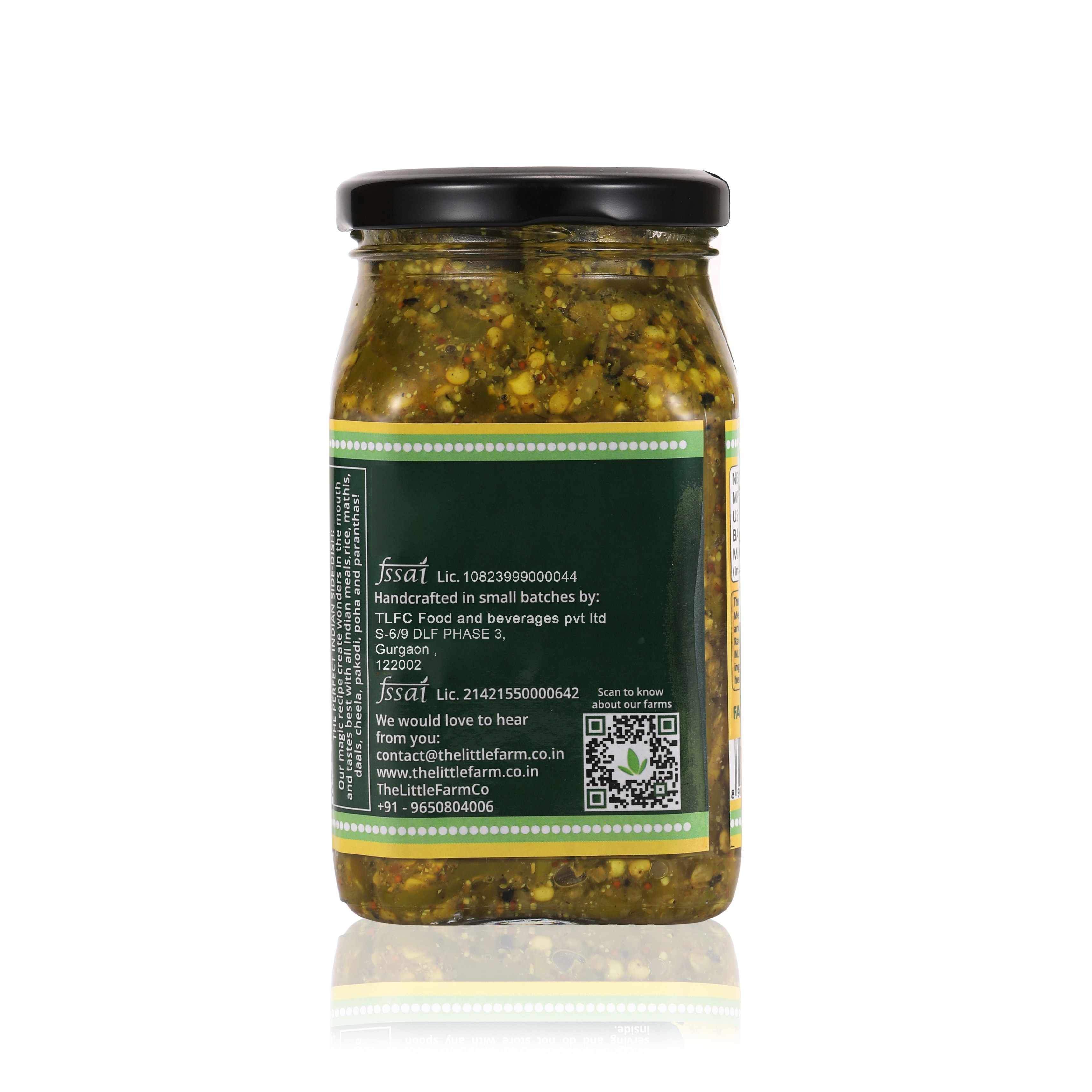 The Little Farm Co. Homemade Green Chilli Pickle (घर का बना हरी मिर्च का अचार): Green chillies pickled to perfection accompanied by the flavour of mustard seeds and freshly squeezed lemons.