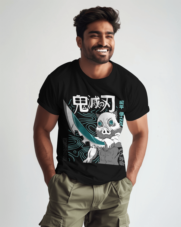 Showcase your fierce side with this black t-shirt featuring a bold design inspired by Demon Slayer: Kimetsu no Yaiba. The artwork highlights Inosuke Hashibira in his iconic boar mask, dual-wielding swords, and surrounded by vibrant teal and white accents with Japanese text for an authentic touch. Made from soft, breathable cotton, this tee ensures all-day comfort and vivid, long-lasting print quality—perfect for anime fans and stylish streetwear looks.