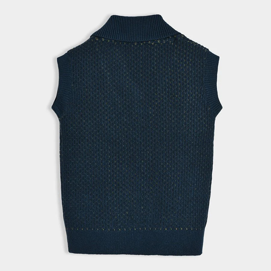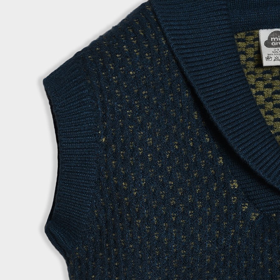 Unisex sweater in soft knit 50% viscose, 20% nylon, and 30% PBT blend for the winter season. Features a shawl collar, contrast knitted designs, and ribbing at the collar, armholes, and bottom hem. Available in different sizes for kids 12M-6Y.
