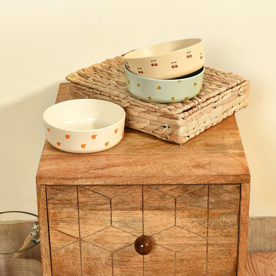 Add a playful charm to your little one's mealtime adventures with the cute bowl set made from premium-grade melamine. Free from harmful chemicals, it includes a handy set of 3 bowls embellished with fruit designs. Best suitable for kids 6M-6Y. Pack of 3.